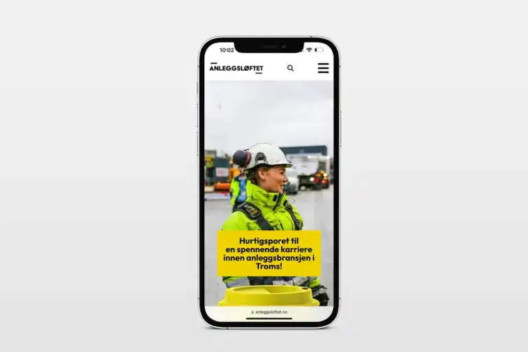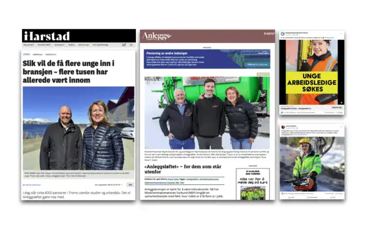Vi utviklet Anleggsløftet – et helhetlig kommunikasjonskonsept som løfter frem anleggsbransjen som en vei inn, ikke bare opp. Gjennom målrettet historiefortelling og sterke visuelle virkemidler viste vi hvordan en jobb i anleggsbransjen kan bli mer enn en karriere: for noen er det et vendepunkt i livet.